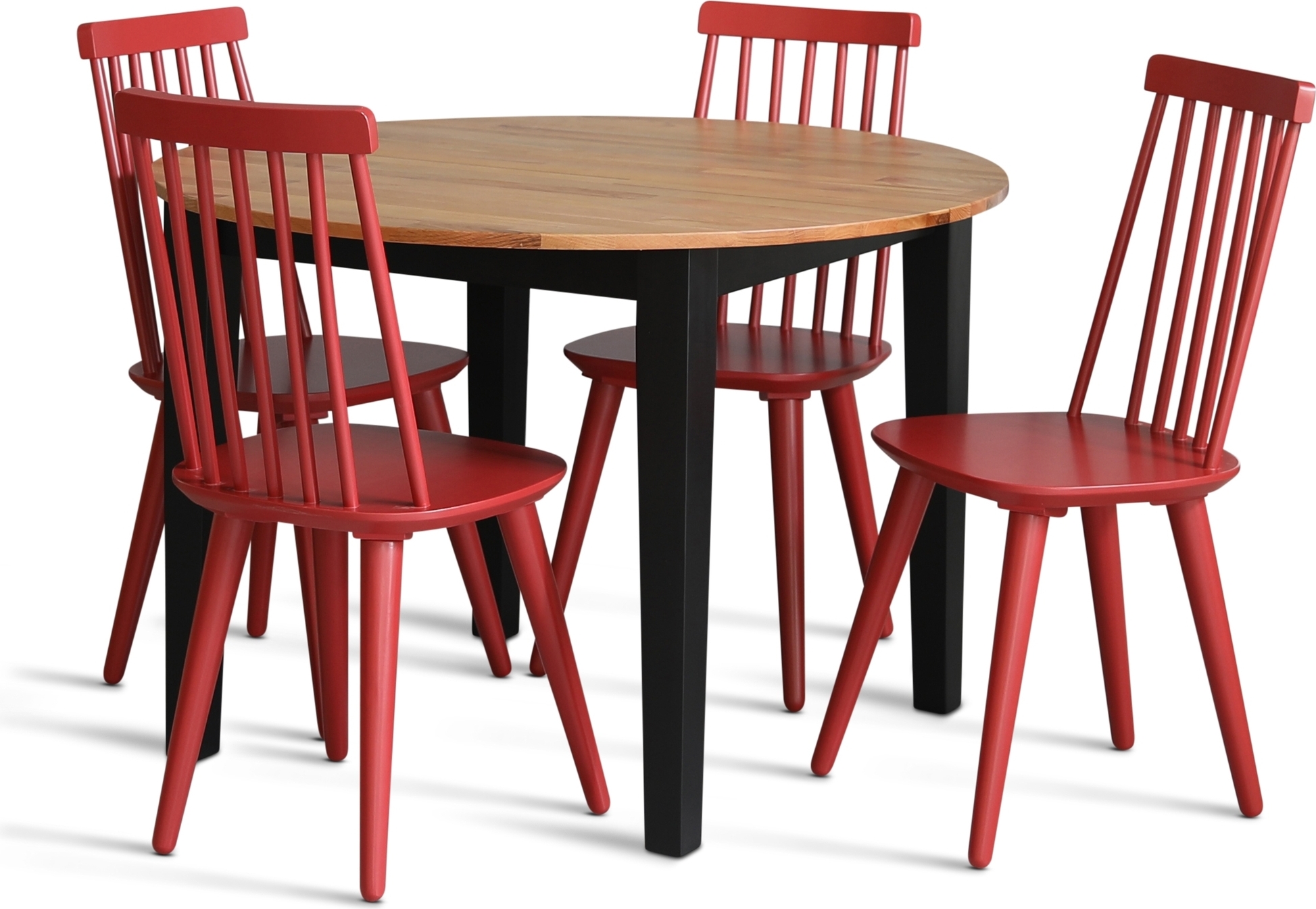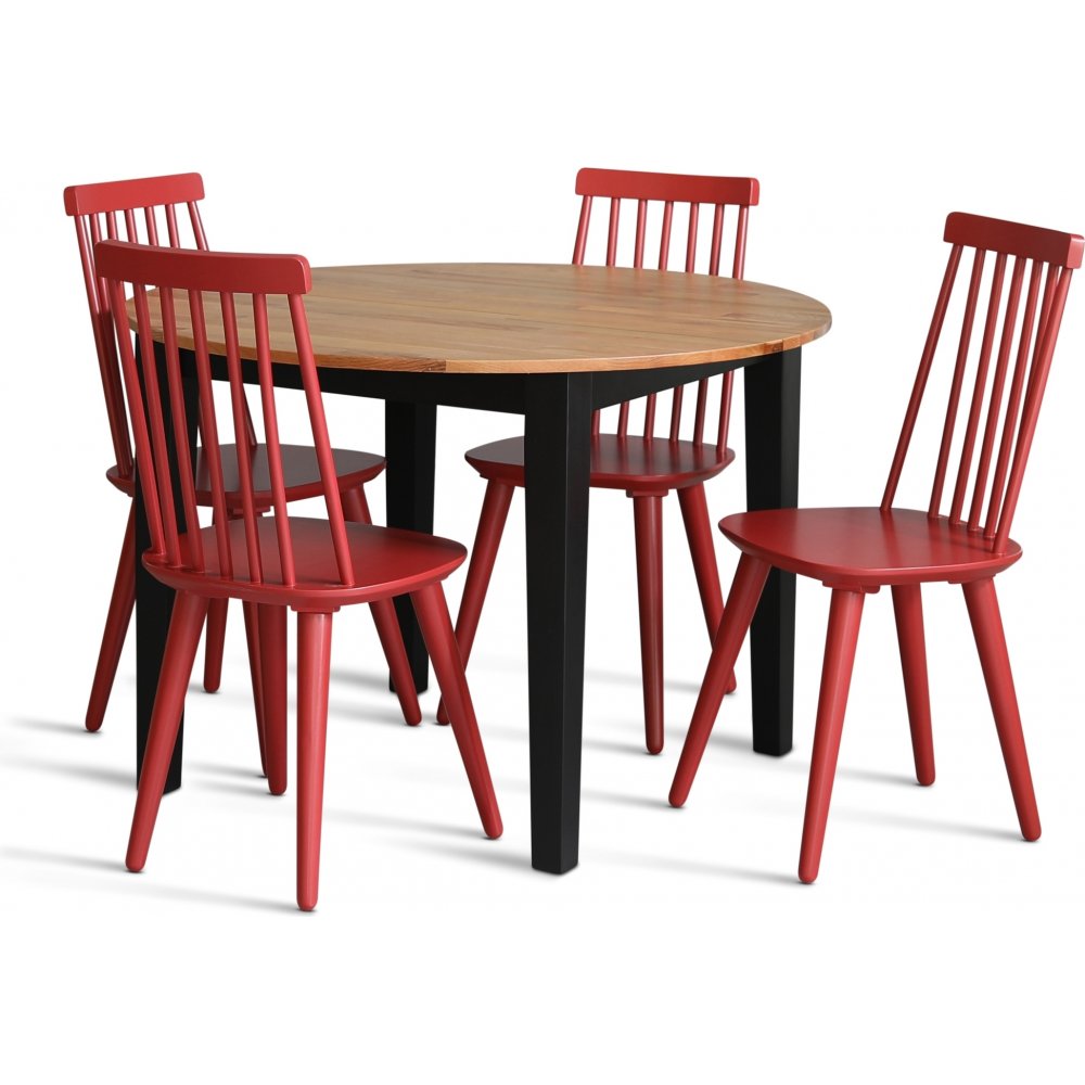 Dalsland spisegruppe: Rundt bord i Eik/Sort med 4 røde Pinnstola