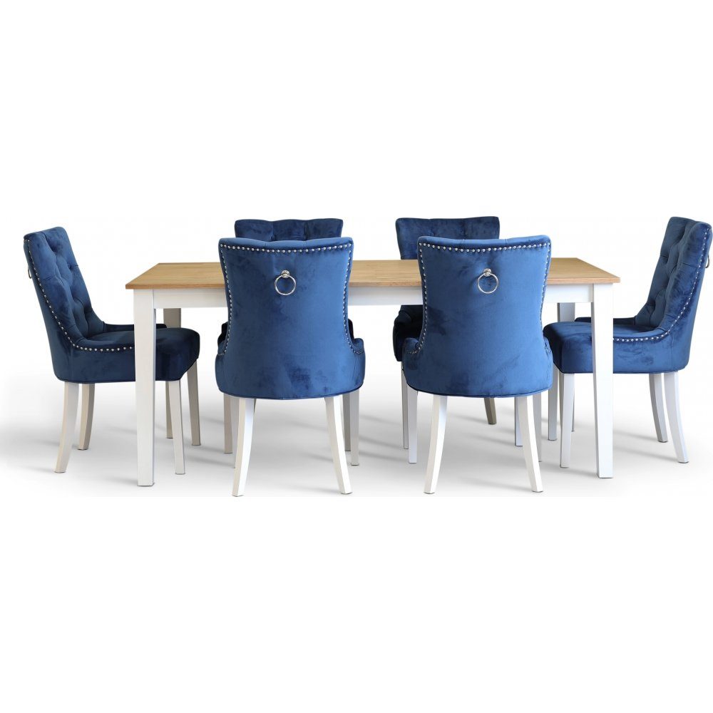 Dalsland spisegruppe: Spisebord i hvit/eik med 6 stk Tuva stoler i blå fløyel