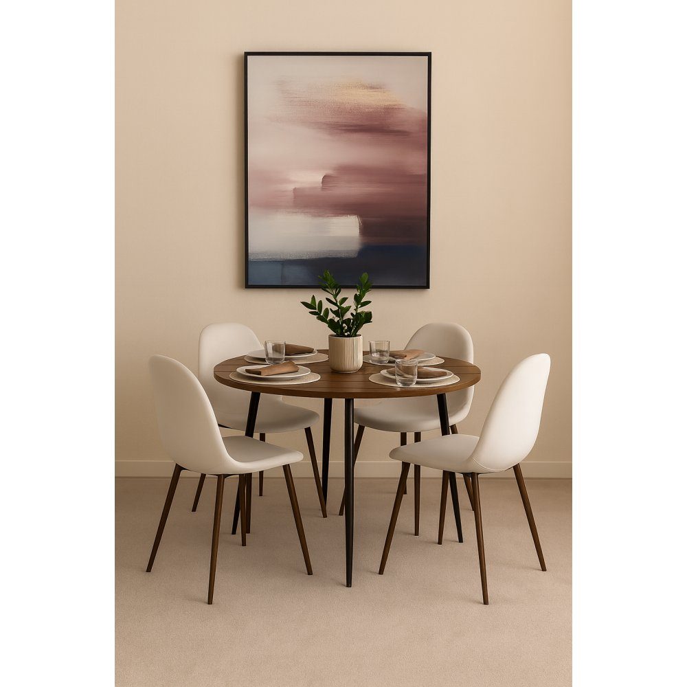 Dana & Alfred spisestuesettet kombinerer en varm trefølelse med moderne eleganse i et balansert og innbydende design. Det runde spisebordet Dana har en topp i valnøttmelamin med naturlig tretekstur og subtile langsgående riller som gir det en ekte og stilig karakter. Den svarte metallbasen med smale, kjegleformede ben skaper en luftig kontrast til den varme bordplaten, og gir et elegant uttrykk som passer til både moderne og klassiske miljøer.