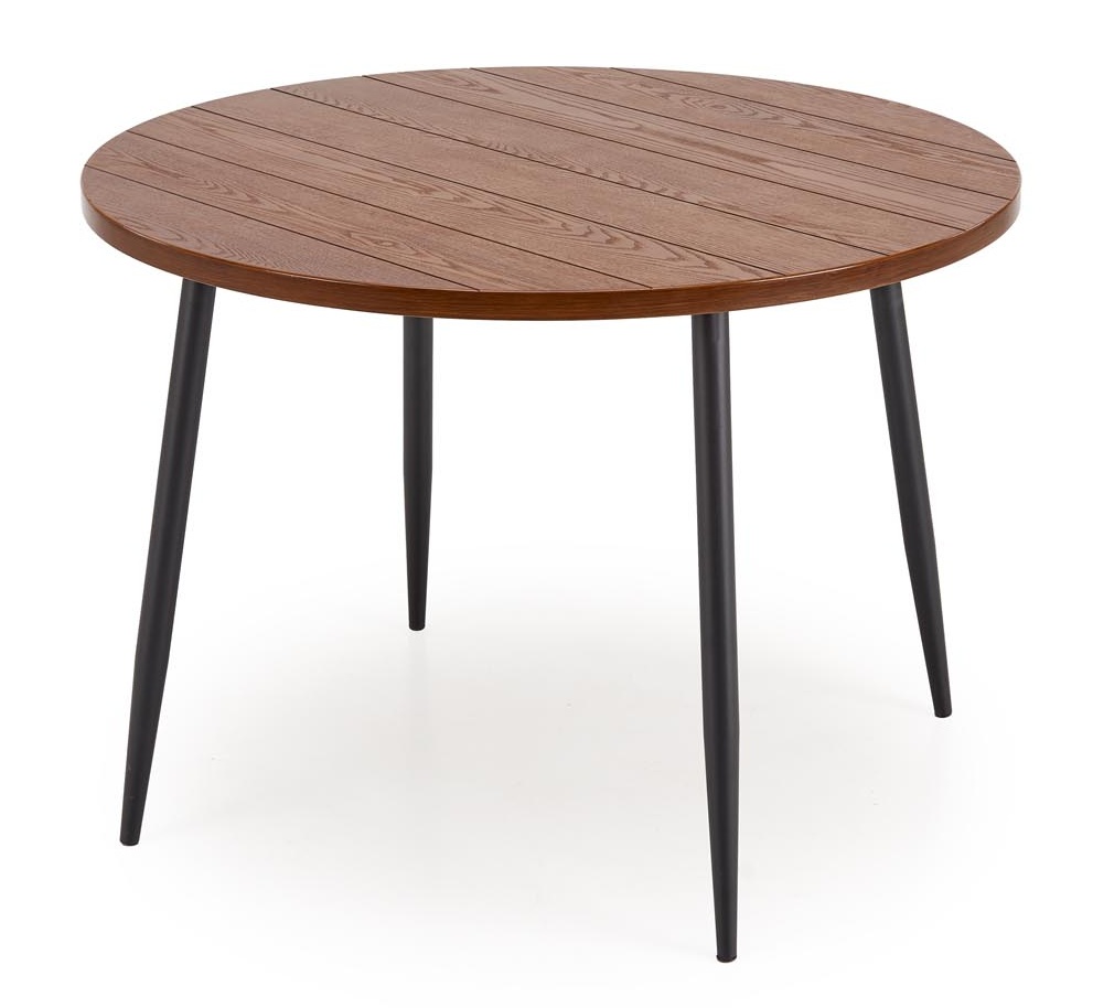 Dana & Sara spisestuesettet kombinerer en varm trefølelse med klassisk eleganse og naturlige materialer. Det runde spisebordet Dana har en vakker valnøttfarget bordplate med en tydelig trestruktur og subtile langsgående riller som gir karakter og dybde. Det moderne designet i svart metall med kjegleformede ben skaper en elegant kontrast og et luftig inntrykk, noe som gjør bordet enkelt å plassere i både moderne og tradisjonelle hjem.