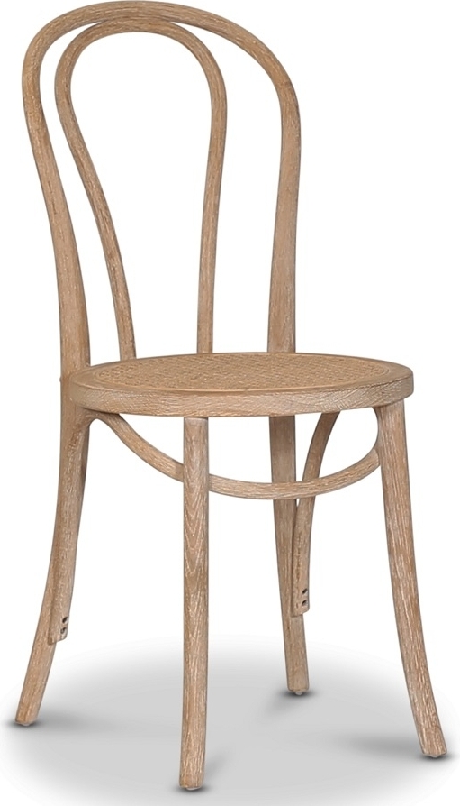 Stilig stol, hvitt pigmentert børstet utseende, bøyd tre med sete kledd i rotting. Rammen er børstet solid alm som er hvit pigmentert, hvor teknologi ble brukt for å bøye treet. Noe som gir stolen sine vakre naturlige former. Kombiner med et av spisebordene våre.