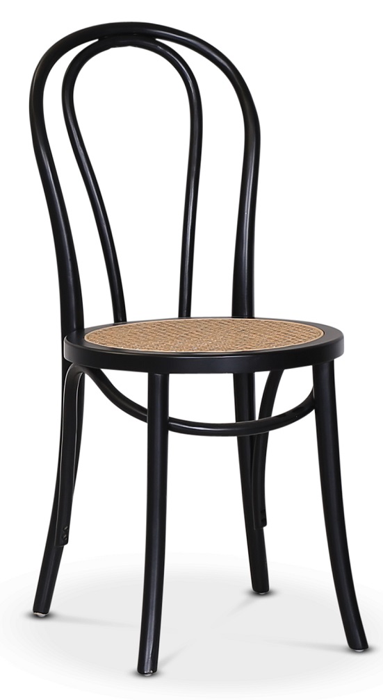 Stilig stol, svart børstet utseende, bøyd tre med sete kledd i rotting. Rammen er børstet solid alm i svart, hvor teknologi ble brukt for å bøye treet. Noe som gir stolen sine vakre naturlige former. Kombiner med et av spisebordene våre.
