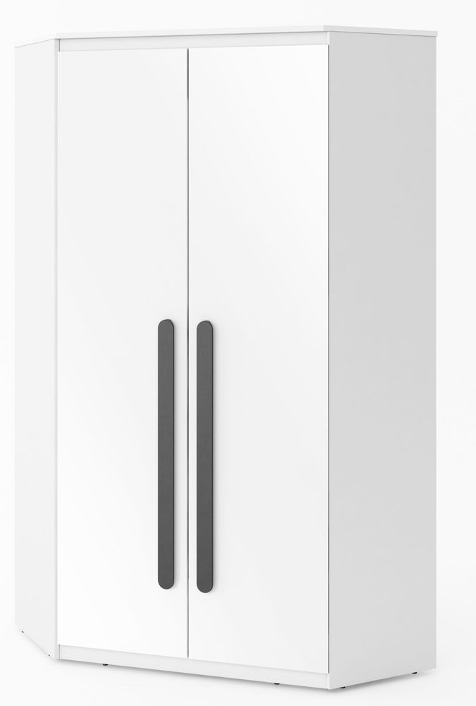 En pen hjørne garderobe med moderne design. Tilvirket i MDF med hvit front i høyglans og veldig gode oppbevaringmuligheter i form av klesstang og hylleplan.