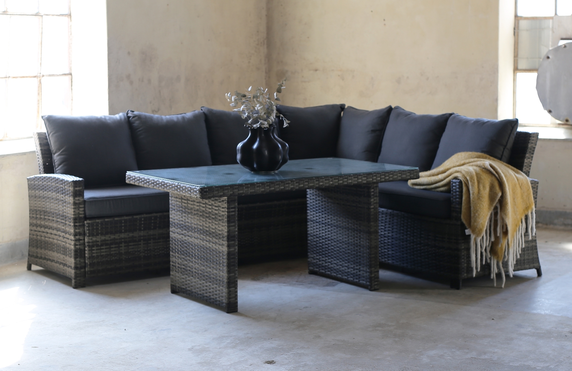 Daven gir deg en klassisk sofagruppe i kunsrotting med tilhørende bord. Fargen er gråmelert, noe som gjør den egnet i de fleste utemiljøer. Ramme i værbestandig aluminium. Komfortable sitteputer polstret i grått trekk. Her kan du tilbringe mange fantastiske stunder med familie og venner. Gråmelert kunstig rotting, topplate i herdet glass. Solid spisebord er inkludert.