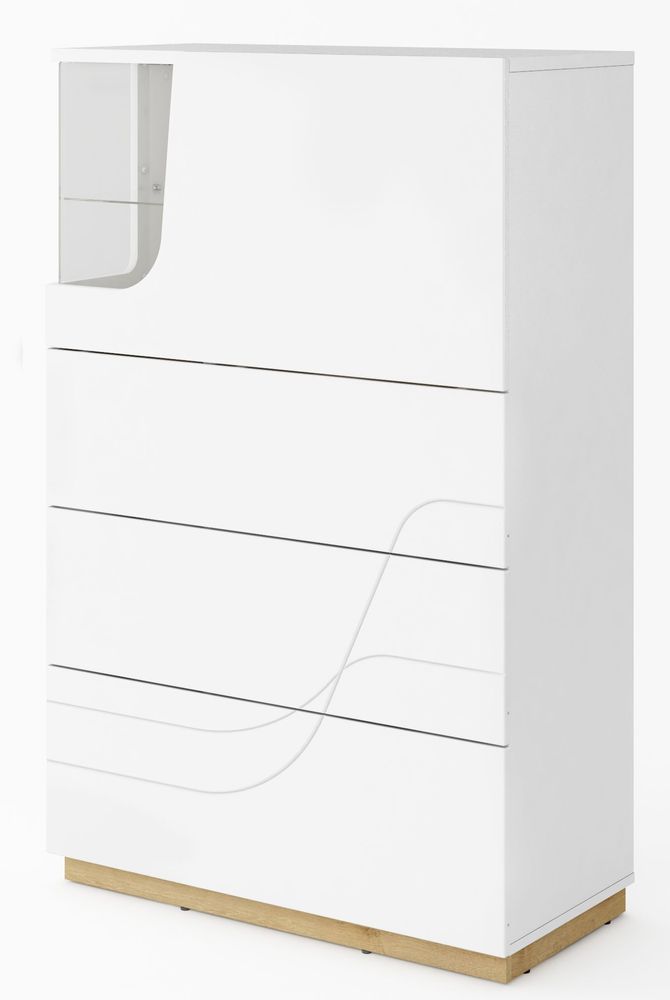 Et fint barskap med en moderne design. Produsert i MDF med høyblank hvit front og utskårne linjer. Innebygd LED-belysning som har godt med oppbevaringsmuligheter i form av et skap og tre skuffer.