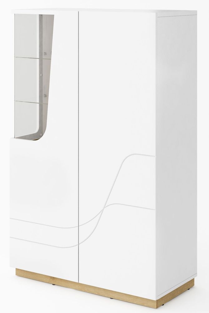 Et fint oppbevaringsskap med moderne design. Produsert i MDF med høyblank hvit front og utskårne linjer. Det ene hjørnet har et glassvindu med LED-belysning, slik at du på en fin måte kan plassere pynt for utstilling. Dørene har push-open/soft-close funksjon.