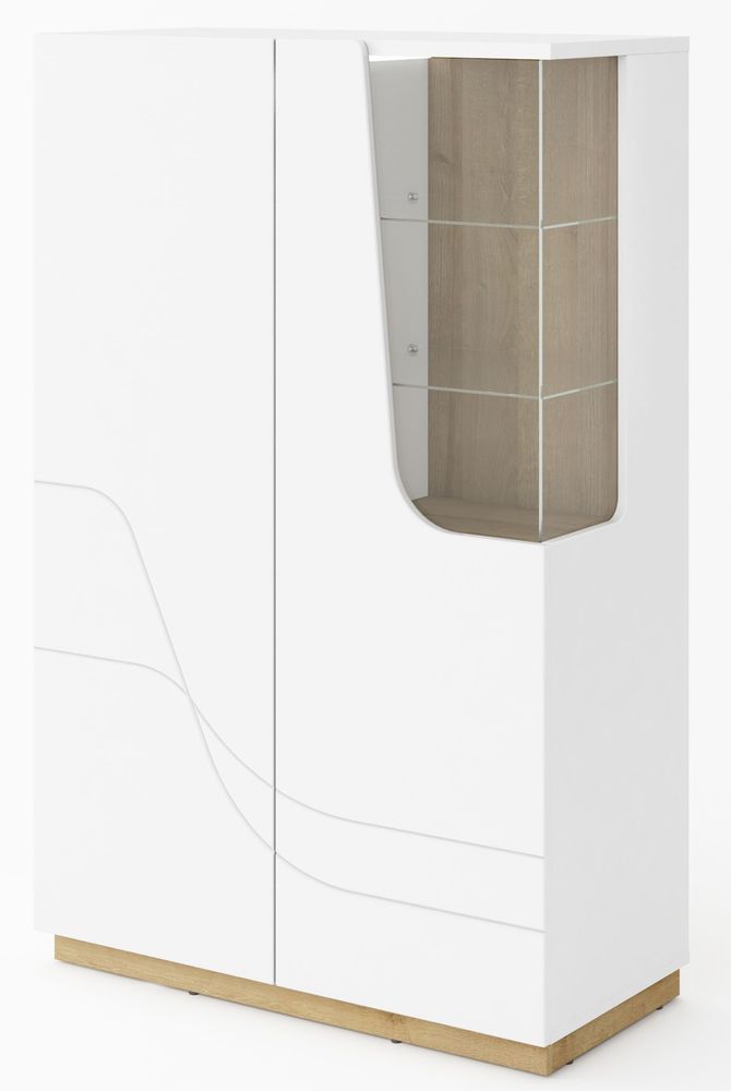 Et fint oppbevaringsskap med moderne design. Produsert i MDF med høyblank hvit front og utskårne linjer. Det ene hjørnet har et glassvindu med LED-belysning, slik at du på et fin måte kan plassere pynt til utstilling. Dørene har push-open/soft-close funksjon.