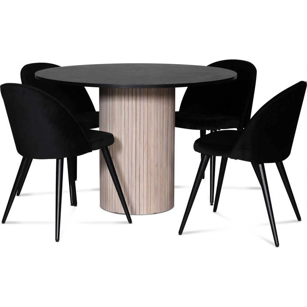 Desibelspisegruppe fra Skånska Möbelhuset, rundt spisebord 110 cm i diameter med fire Alice spisestoler i svart fløyel med svarte metallben. Understellet av bordet er i whitewash med bordplate i svartfarget eikefiner.