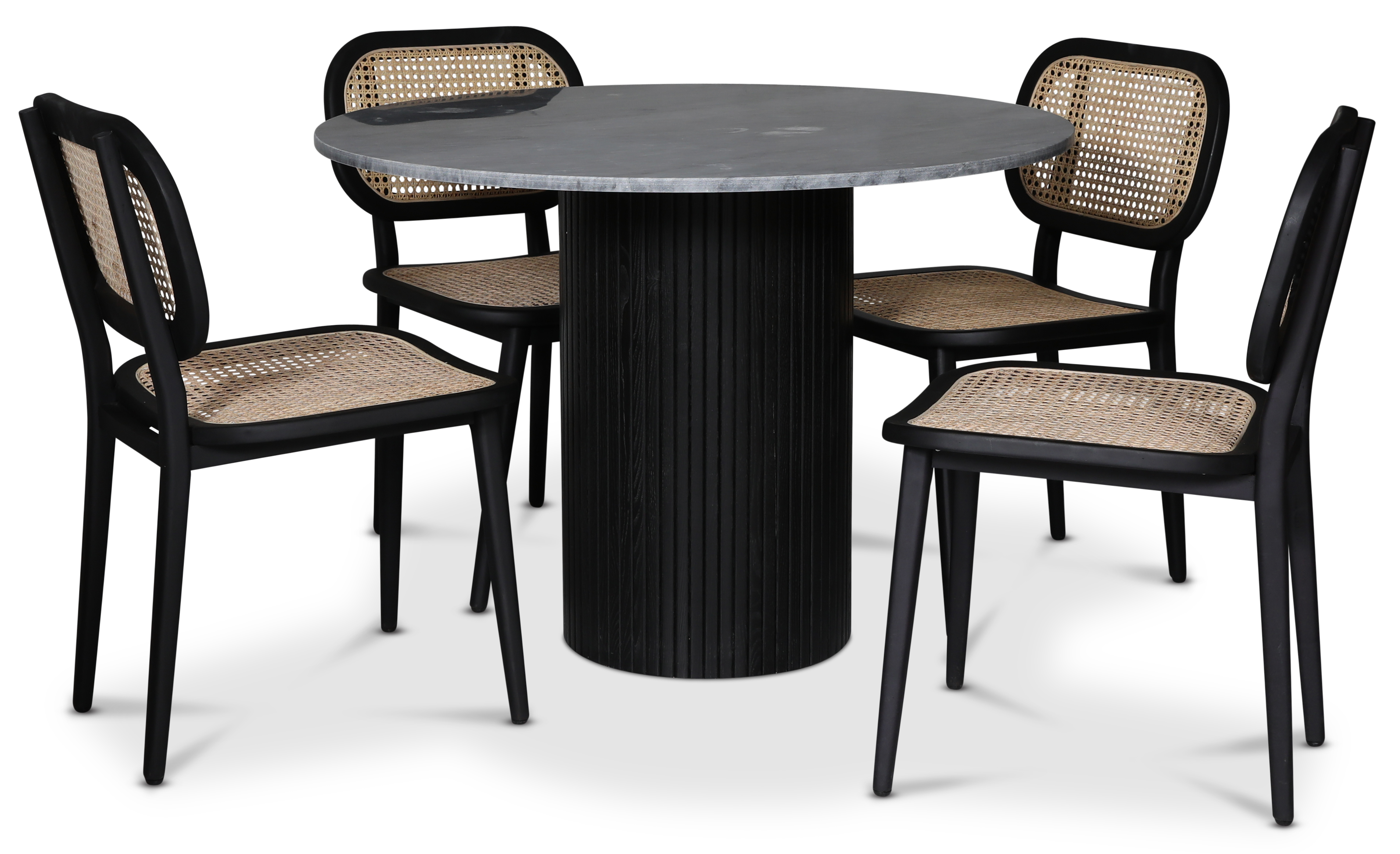 Decibel spisegruppe fra Skånska Möbelhuset, rundt spisebord med en bordplate på 110 cm i grå marmor med fire Siknäs-stoler i svart tre med rotting.