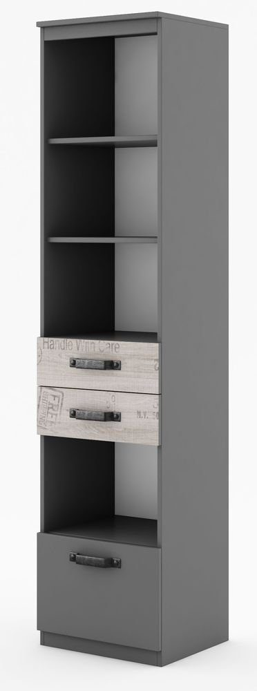 En pen bokhylle med moderne design. Tilvirket i MDF med gode oppbevaringmuligheter i form av fire åpne hylleplan og tre skuffer.