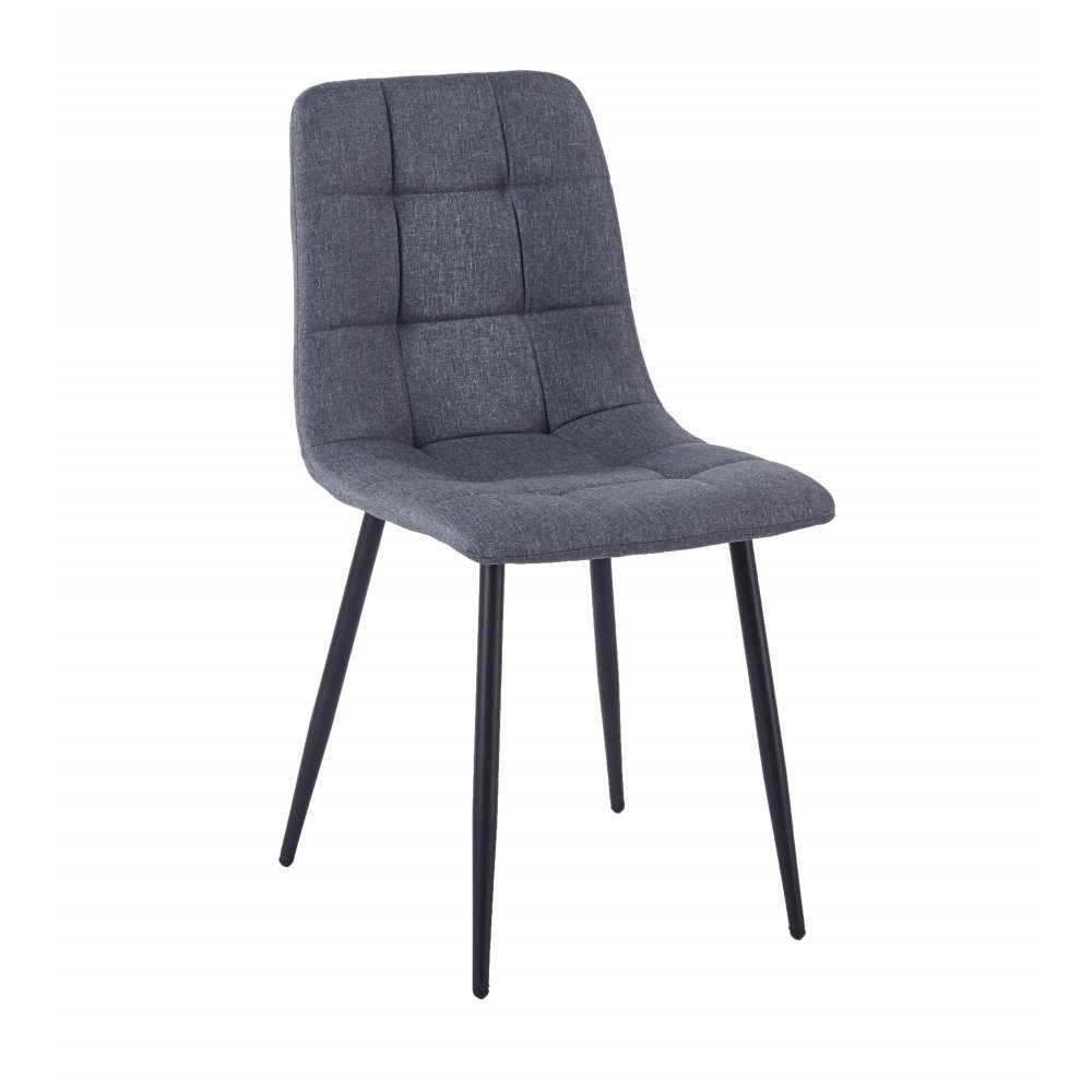 Delta spisestol i grått slitesterkt stoff med matchende metallben i matt sort lakk.
