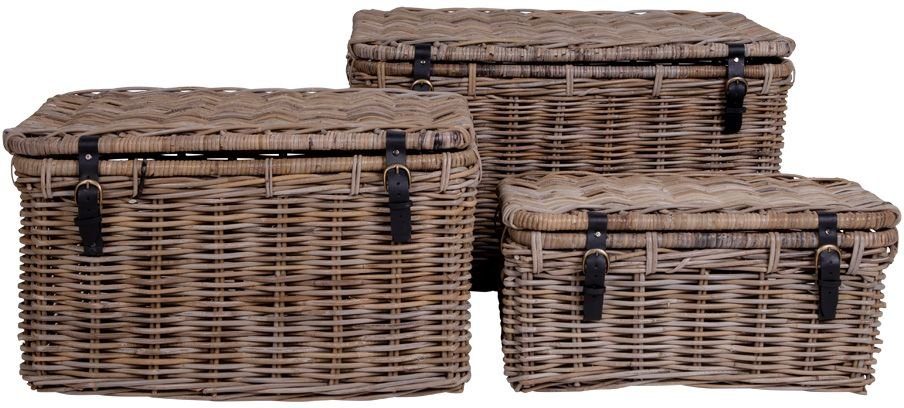 Tre oppbevaringskurver i grått med lærhåndtak.