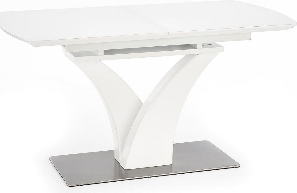 Et fint spisebord med moderne design. Bordet er produsert av lakkert MFP (premium treplate), bordplaten har en topplate i klart glass og understellett har en fot av rustfritt stål. Bordet er praktisk, siden du lett kan forlenge bordplaten opp til 180 cm, tilleggsplate er inkludert.