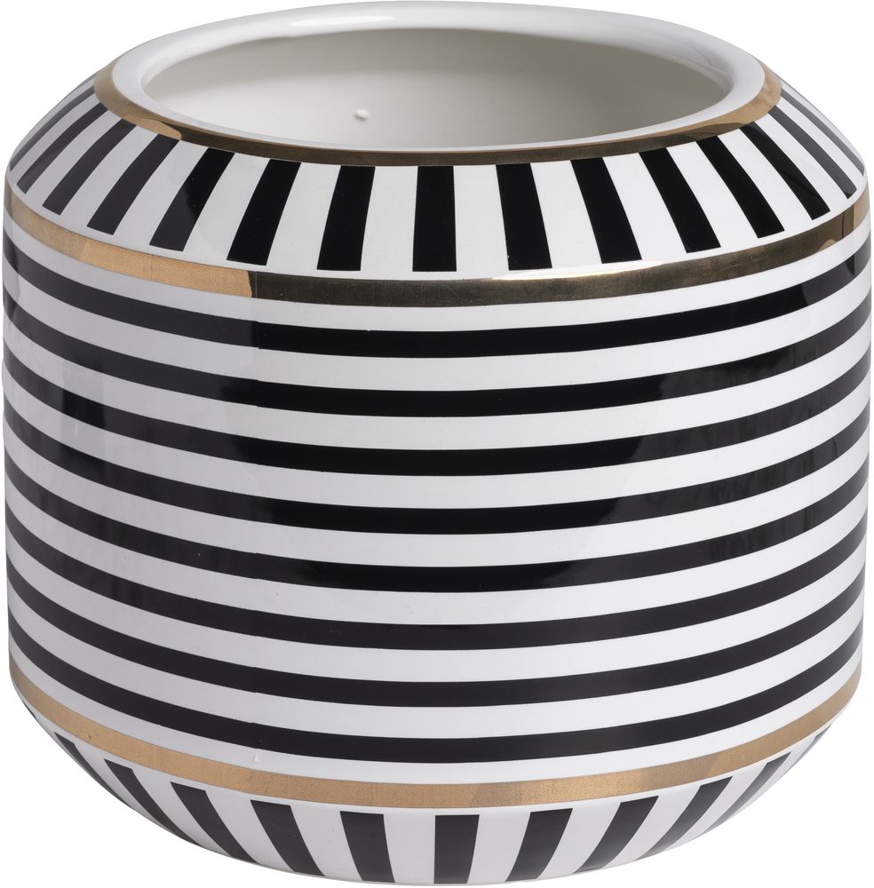 Vase av glasert keramikk med fine striper i gull og svart.