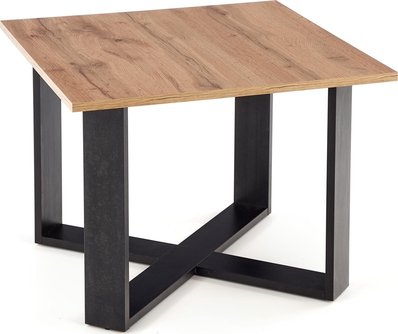 Dette salongbordet er en stilig kombinasjon av industriell estetikk og moderne design. Bordplaten i treeffekt gir en varm og naturlig følelse, mens den robuste sorte metallunderstellet med kryssede ben skaper en sterk og stabil konstruksjon som vekker oppmerksomhet.
