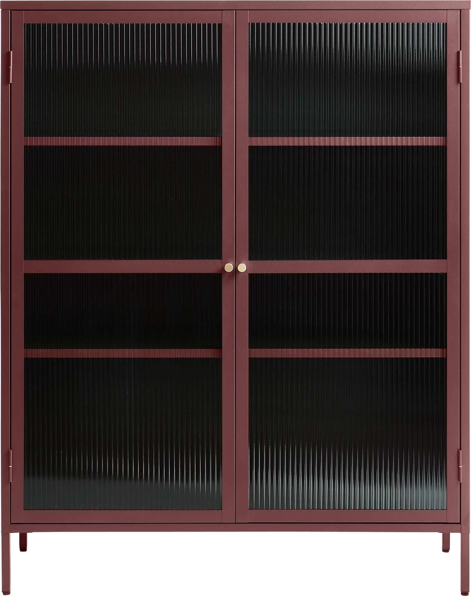 Dobb vinrødt metallskap med dører i ekte foret glass. Håndtak i messing. Skapet har en stabil metallkonstruksjon.