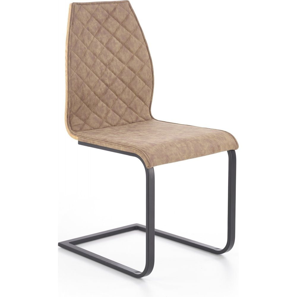 En koselig spisestol med moderne design. Spisestolen er tilvirket av laminert kryssfiner og understellet er av pulverlakkert metall. Setet er trukket med et veldig behagelig kunstskinn for maksimal komfort.