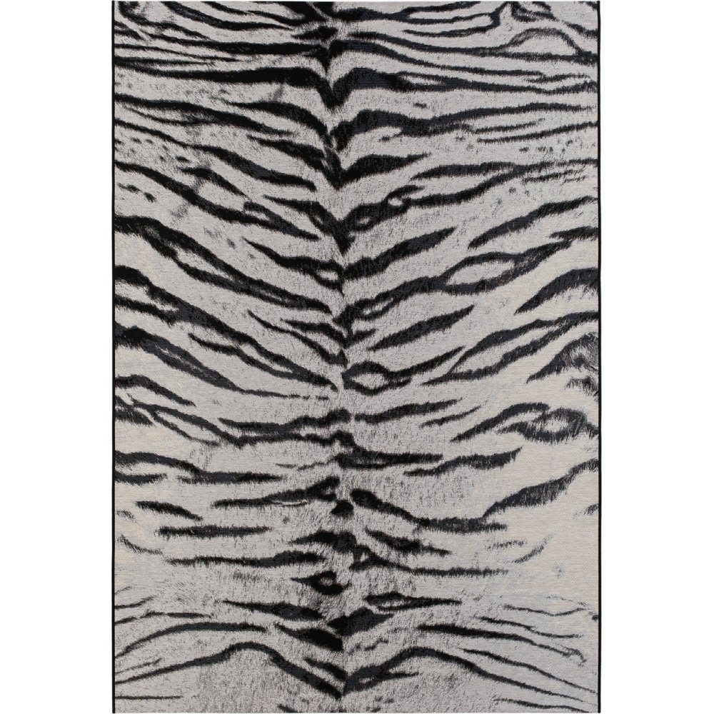 Domani Tiger Silver er et moderne teppe med en ekstra klo. Teppet har et tigermønster i kremhvitt og sort. En matchende svart tunge løper langs langsidene. Teppet er fint å ha både på balkongen, terrassen og i vinterhagen. Med sine behagelige farger skaper teppet en koselig følelse. Siden teppet er laget av 100 % polypropylen og ikke inneholder jute-tråder, tåler det fuktighet og egner seg derfor like godt innendørs som utendørs. Siden teppet ikke har noen tett luv hvor skitt kan sette seg fast, er det lett å rengjøre og støvsuge.