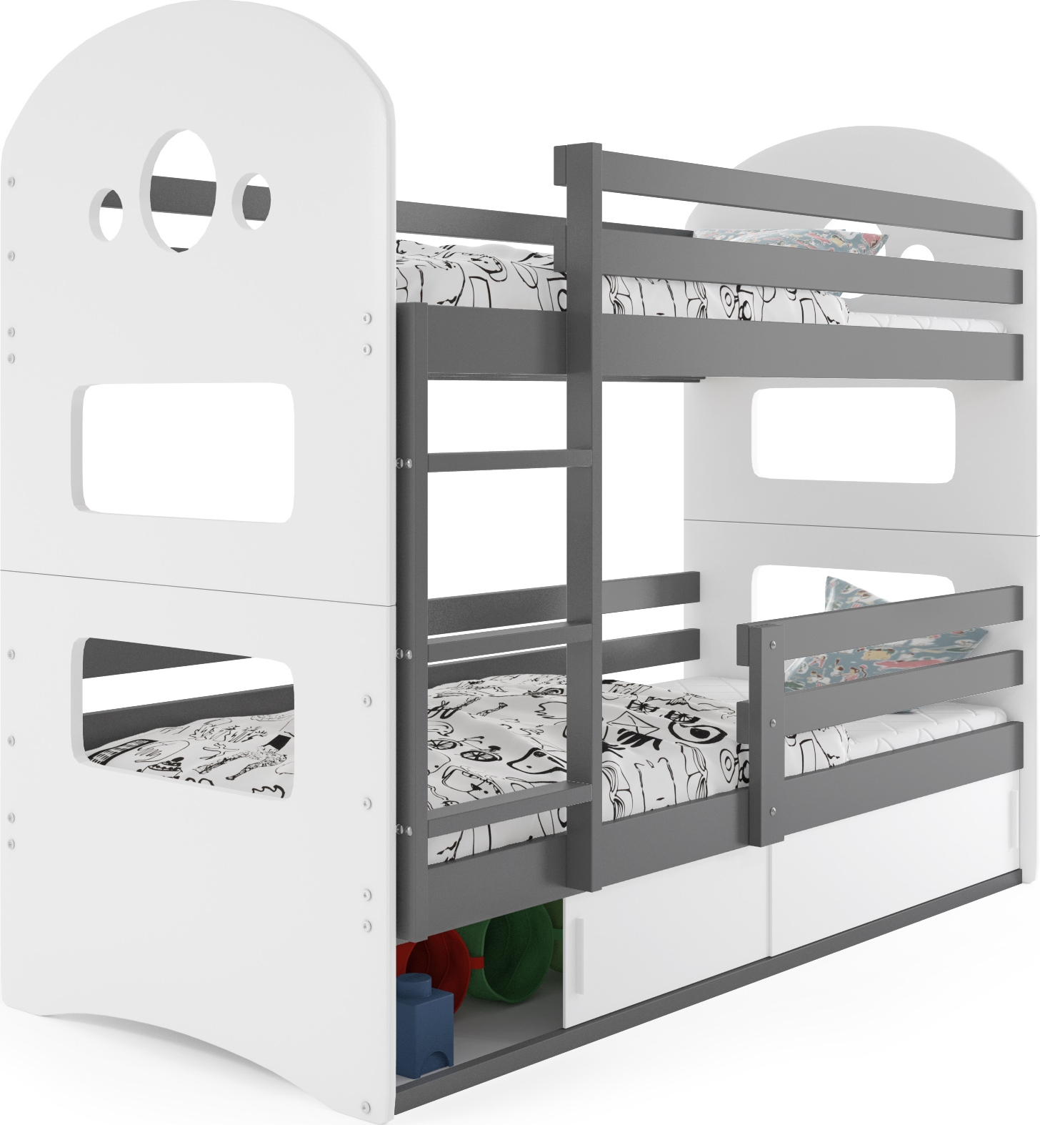 Køyeseng med oppbevaringsrom bak skyvedører. Sengen er bygget på en ramme i massiv furu med ribber av bjørketre som hviler på metallskinner. Sider og panel er av MDF. Sengen er lakkert / malt med vannbasert allergivennlig lakk/maling. Plassering av sikkerhetsbarrierer og stige er valgfritt og gjøres av kunden ved montering. Madrassene laget av 7 cm polyuretanskum har et trekk av hypoallergent polyesterstoff. Trekket er utstyrt med glidelås og kan fjernes for vask. Sengen er laget i henhold til TÜVs kvalitets- og sikkerhetsstandarder. Sengen leveres umontert.