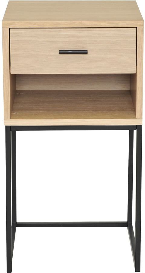 Nattbord med skuff og hylle i hvitpigmentert eikefiner og understell i sortlakkert metall.