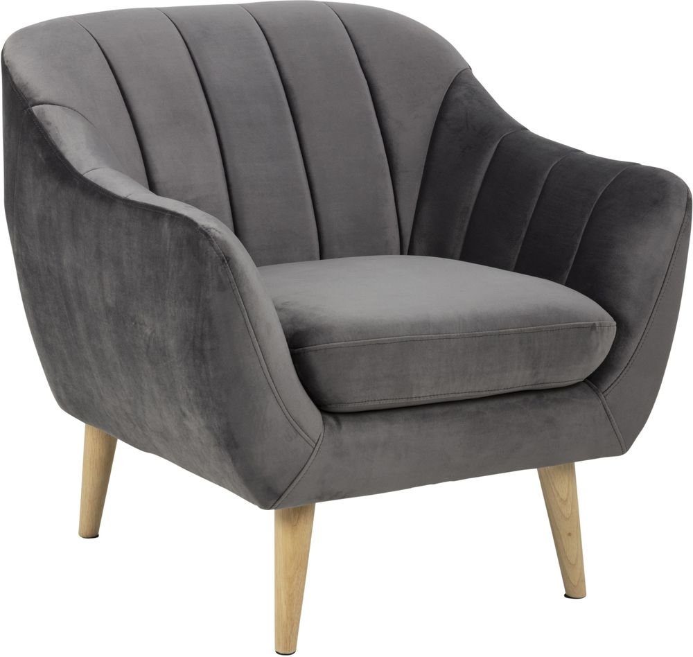 Lenestol med en robust stomme. kledd med et behagelig mørkegrått fløyelstoff for maksimal komfort. Bena er laget av oljebehandlet gummitre.