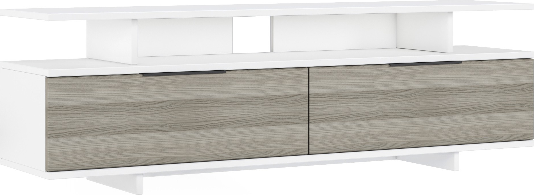 Mediabenk laget av melaminbelagt sponplate. Metallhåndtak. Maks vekt: 90 kg.