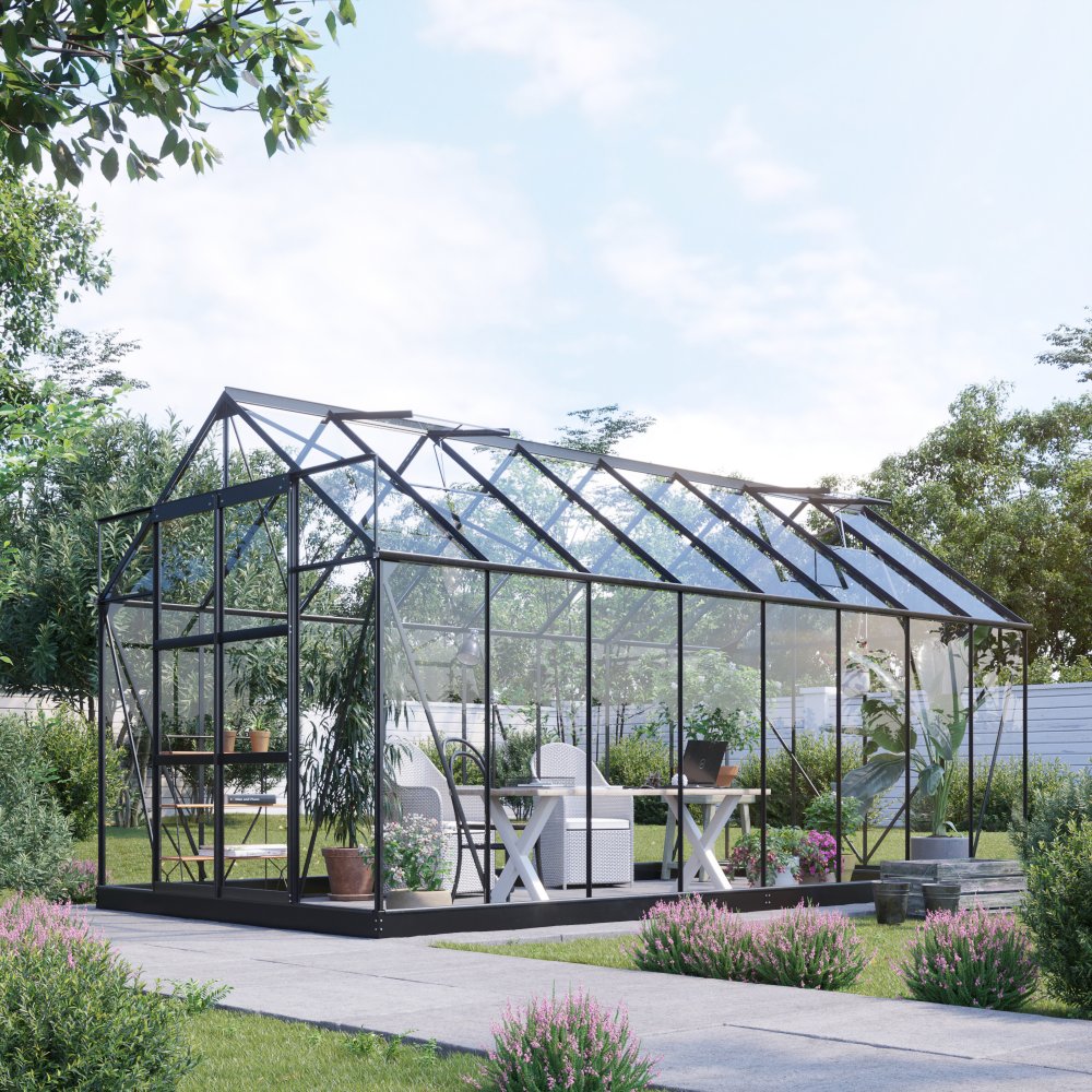 Drivhus Neptunus er tilgjengelig i valgfrie fargene sort og aluminium.