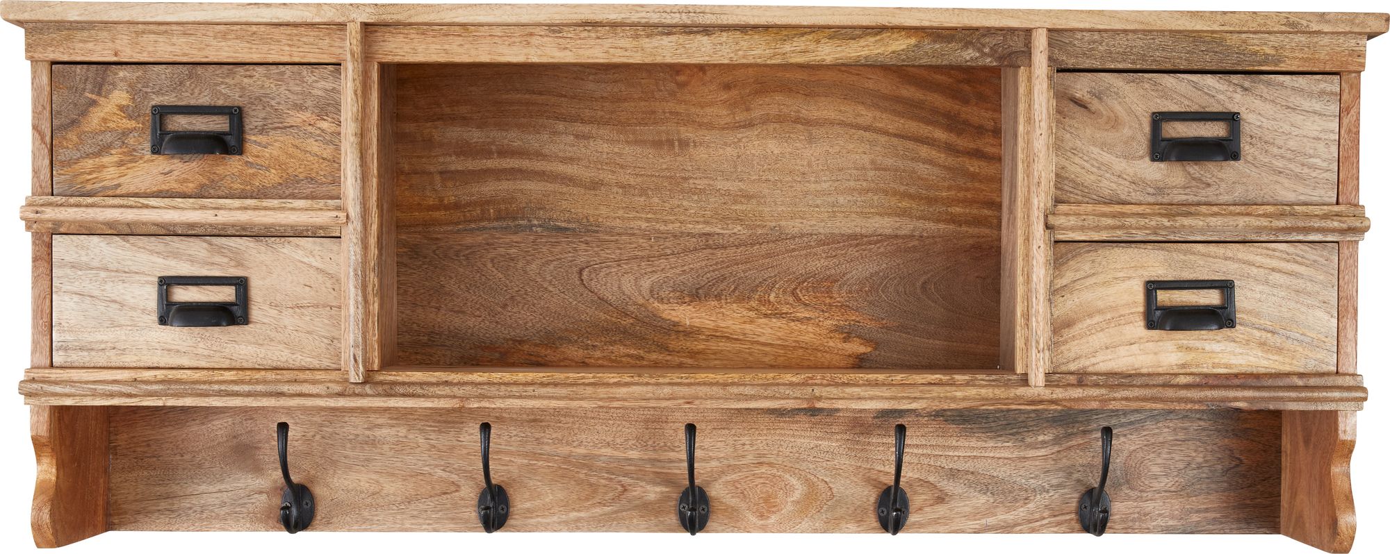 Due vegghengt kleshenger i mangotre med naturlig trefinish. Utstyrt med 5 kroker for oppheng av klær, samt hylle og 4 skuffer til oppbevaring.