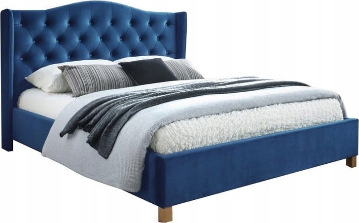En fin seng med elegant design. Sengen er produsert av solid tre og kledd med et behagelig fløyelstoff for maksimal komfort.
