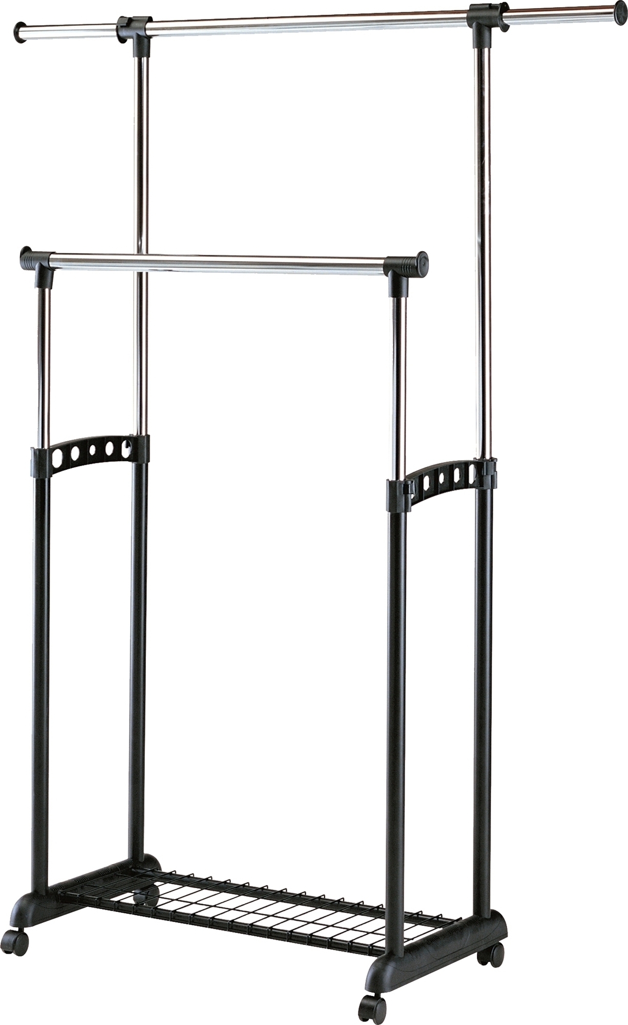 Praktisk klesstativ med to justerbare klesstenger i metall og en hylle til plassering av for eksempel sko. Lett å forflytte med hjelp av hjulene under. Klesstativet passer perfekt inn på flere ulike plasser i hjemmet og har mange ulike bruksområder.