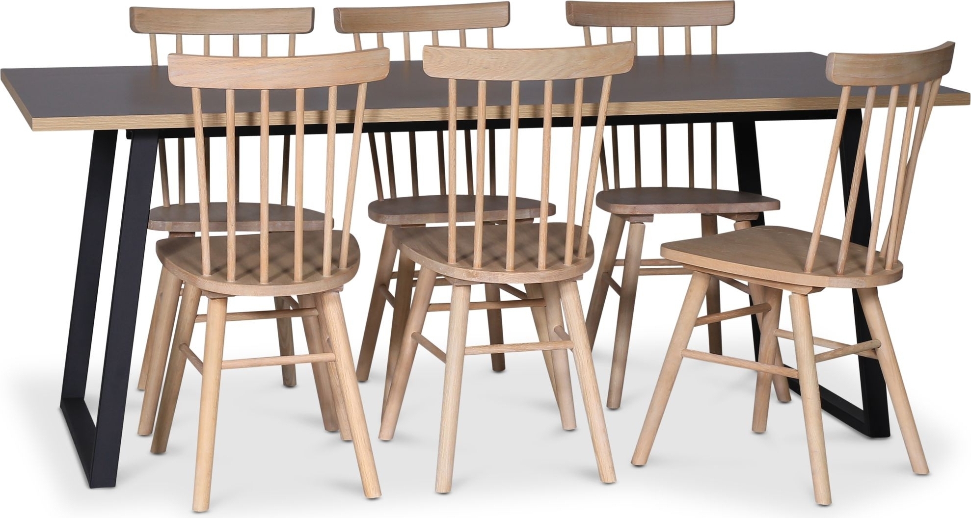 Det følger med 6 stk. Orust pinnestoler, en svenskdesignet klassisk pinnestol i massiv hvitoljet eik, en slitesterk tresort med høy tetthet som gir stolen en god tyngde og kvalitet. Stolen er i et design med seks ribber på i stolryggen. Den har et dypere sete og en mer stabil konstruksjon.