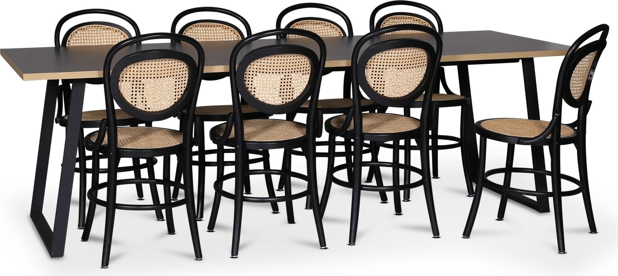 Inkludert 8 stk. Alicia stol i bøyd tre av massiv bøk, svart ramme med naturfarget rotting i sete og ryggstøtte.