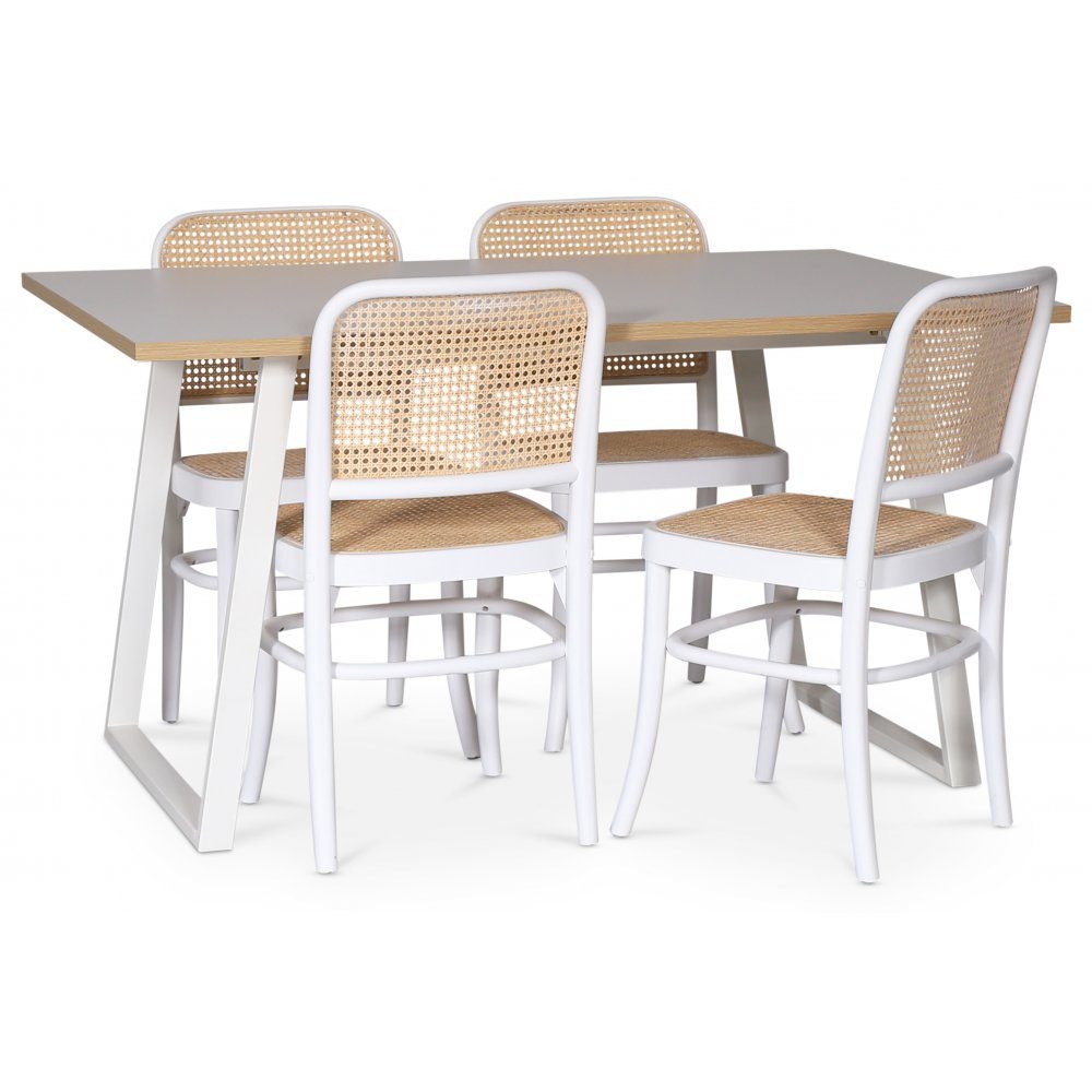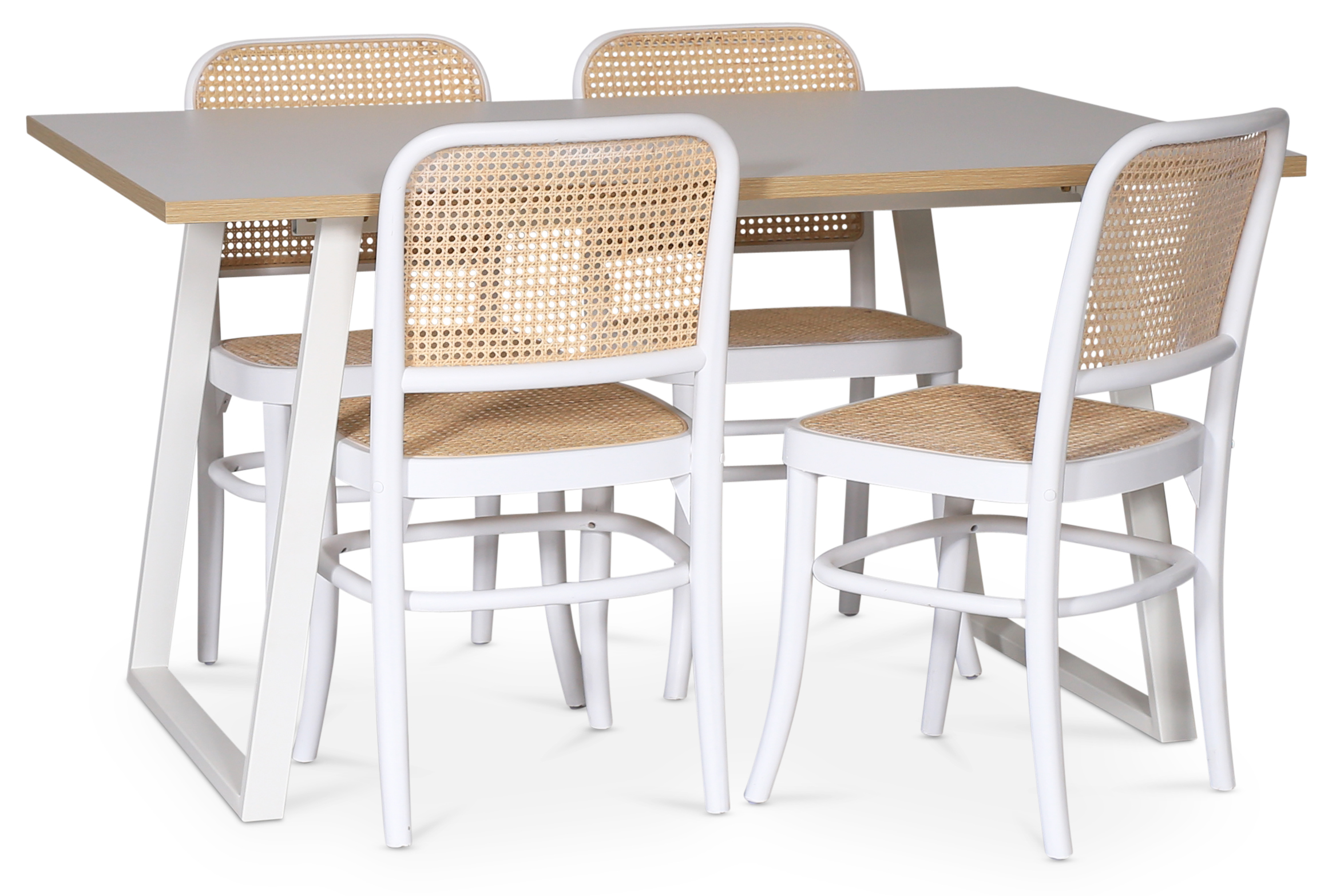 Edge dining gruppe; Spisebord i hvit HPL 140x90 cm med 4 hvite Tyko stoler med rotting