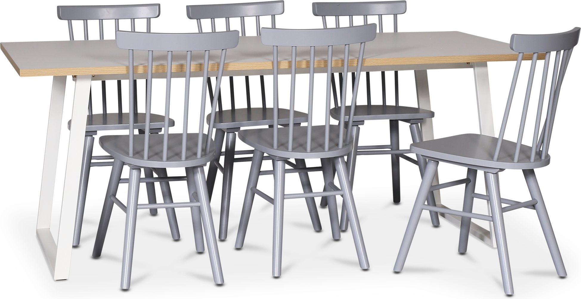 Edge dining gruppe; Spisebord i hvit HPL 190x90 cm med 6 grå Orust stokkstoler