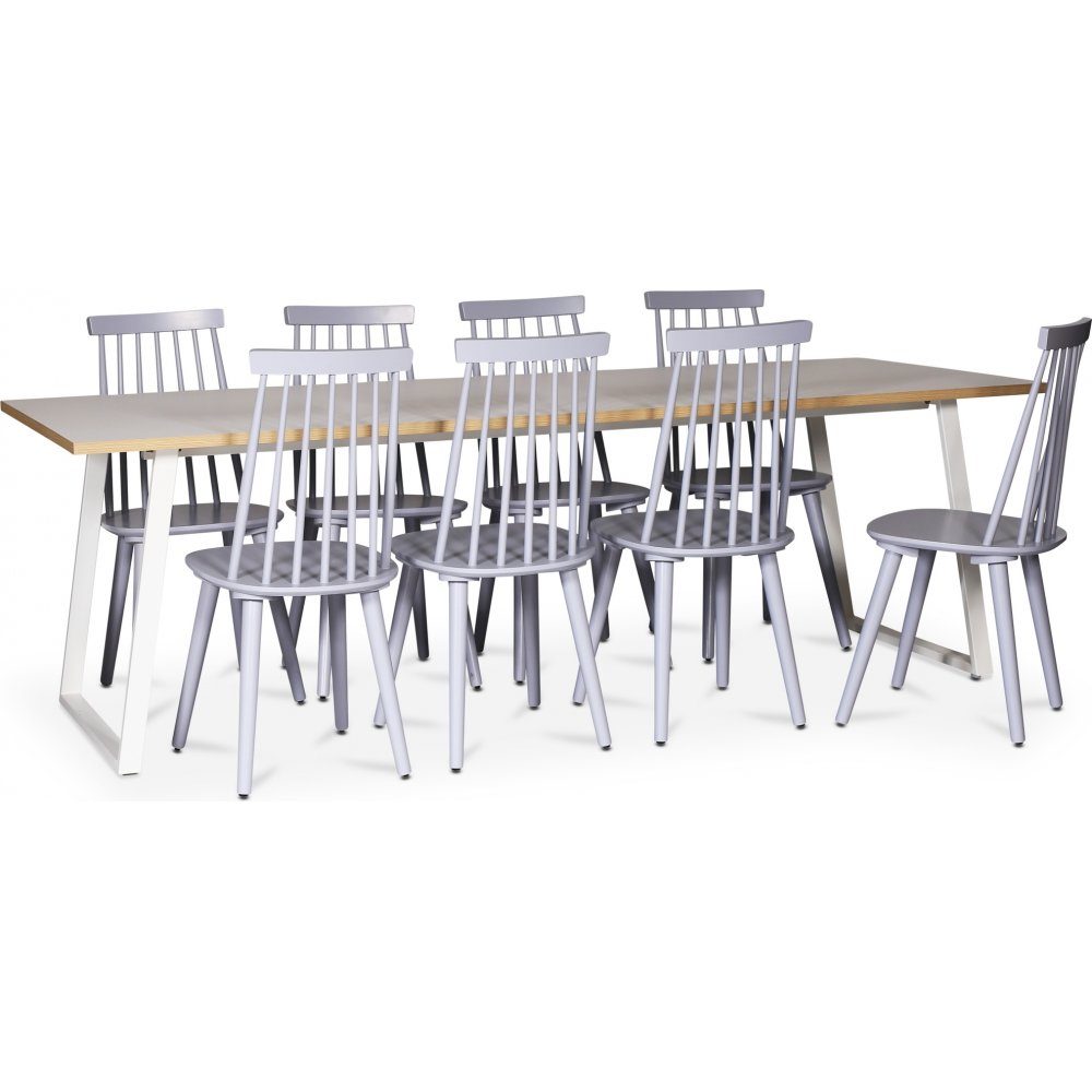 Edge spisegruppe med 8 stoler; Edge spisebord 240x90 cm med hvit høytrykkslaminat som tåler det meste. Dette inkluderer 8 matchende grå Dalsland stokkstoler.