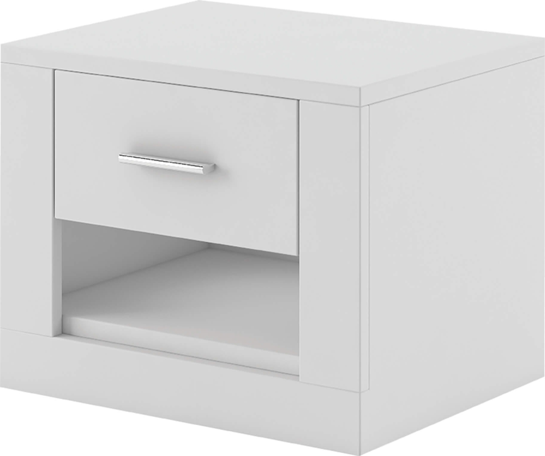 Nattbord av sponplater. Plasthåndtak med matt finish. Leveres umontert.