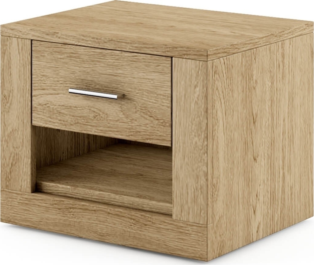 Nattbord av sponplater. Plasthåndtak med matt finish. Leveres umontert.
