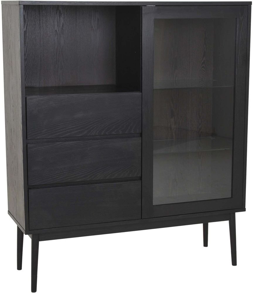 Et stilig skap med moderne design. Laget i MDF/tre med fin sortlakkert ask finer. En åpen hylle, tre skuffer og et skap med hyller for smart oppbevaring. Skapdøren har et klart glassvindu.
