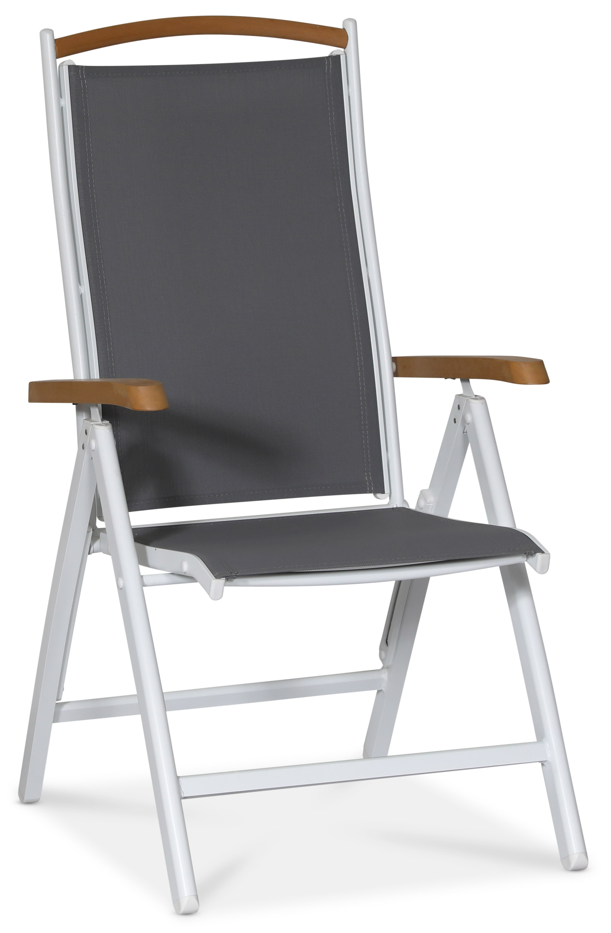 Ekenäs posisjonsstol med hvitlakkert aluminiumsramme med grå tekstil og eik-polywood. Perfekt stol for spiseplassen ute. Kan justeres i forskjellige posisjoner.