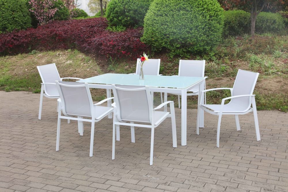 Moderne spisegruppe med ramme i hvitt værbestandig aluminium og beige stoff i stolene. Stolene kan stables. Bordplaten er laget av 6 mm matt lysegrått herdet glass. Spisegruppen er også tilgjengelig i antrasitt.