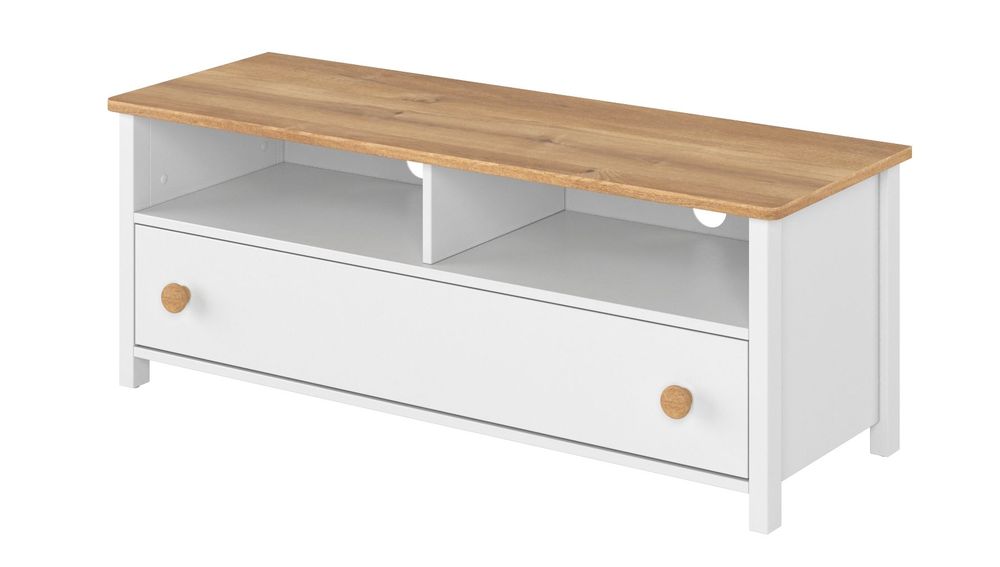 En pen TV-benk med en klassisk design. Tilvirket i MDF med gode oppbevaringmuligheter i form av en bred skuff og to åpne hylleplan med boret kabelhull som er perfekt for elektronikk.