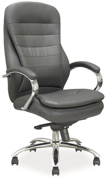 En stilig kontorstol med moderne design. Stolen er laget av metall og plast, med et meget behagelig trekk i syntetisk skinn. Stolen har justerbar høyde ved hjelp av spaken under setet. Stolen er også lett å flytte takket være hjulene på stjernebasen.