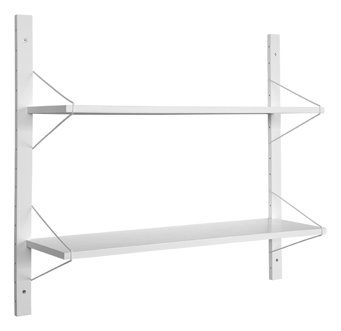 Elma er en hylleserie som har blandet retrodesign fra 60-tallet med dagens stilrene design. Hvitlakkerte hylleplan og konsoller.