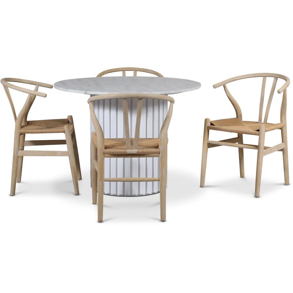 Empire spisegruppe Ø105 cm inkl. 4 stk. Brandon spisestoler whitewash - Lys marmor / Hvit lamell trefot + Møbelføtter
