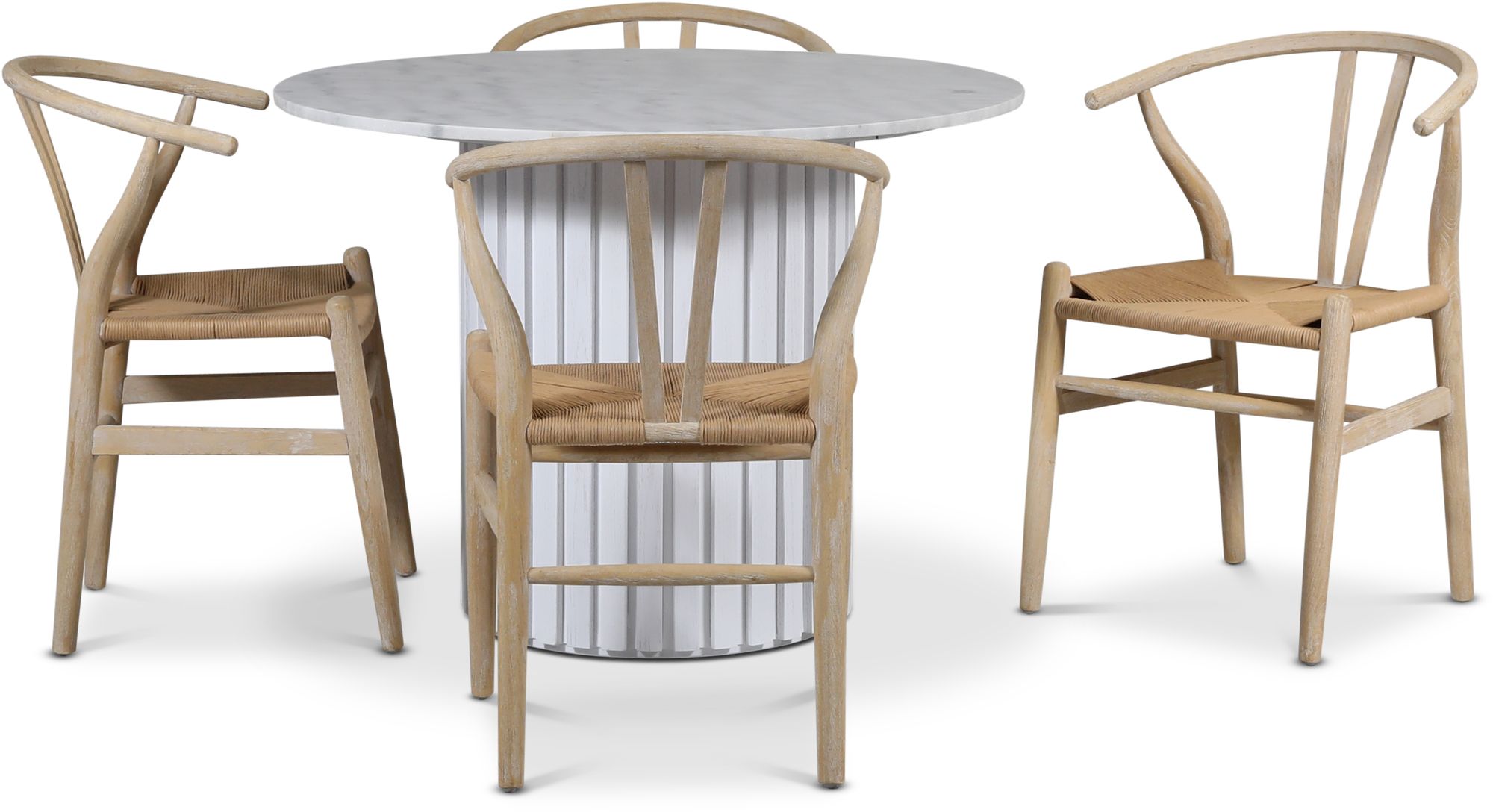 Empire spisegruppe Ø105 cm inkl. 4 stk. Brandon spisestoler whitewash - Lys marmor / Hvit lamell trefot + Stolpute