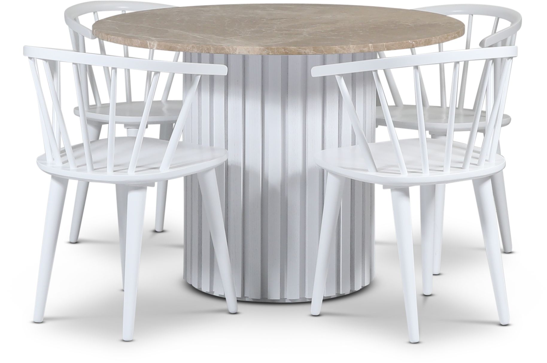 Empire spisegruppe Ø105 cm inkl. 4 stk. Dalsland hvite karmstoler - Empradore marmor / Hvit lamell trefot:
