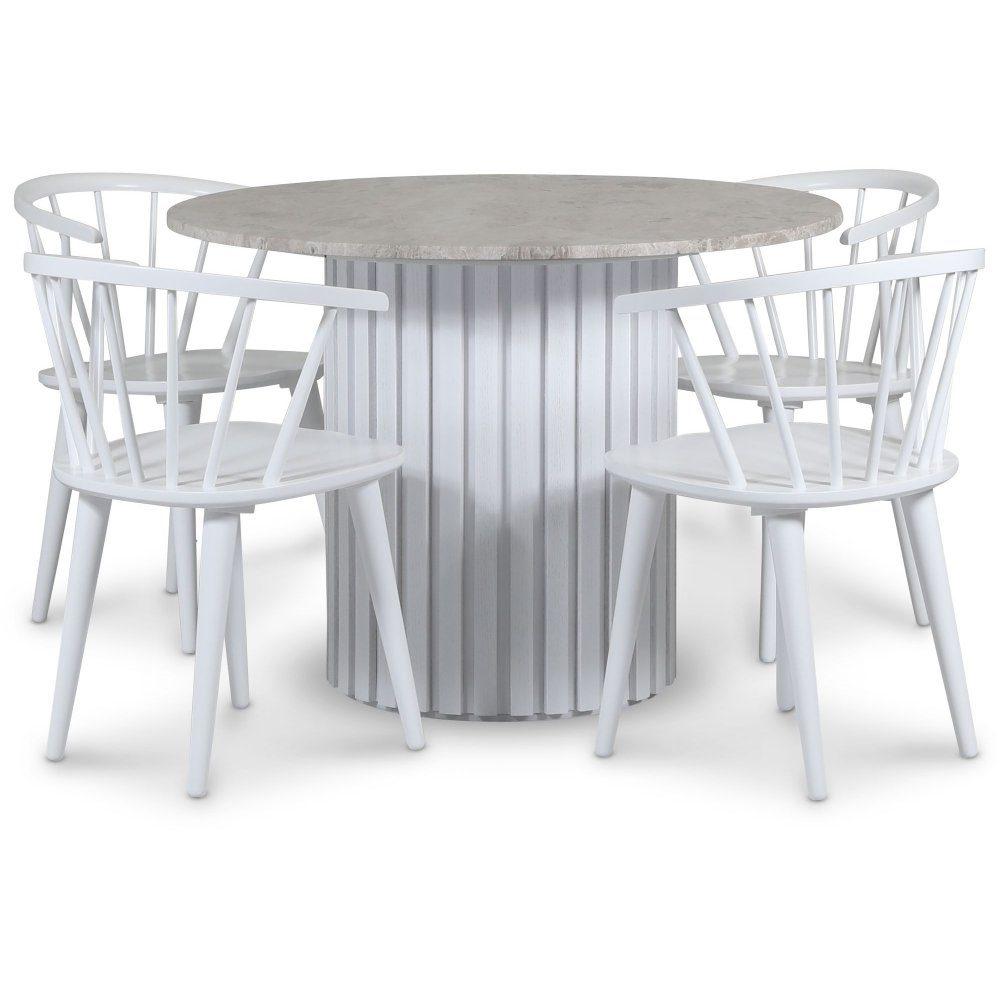 - Empire spisegruppe Ø105 cm inkl. 4 stk. Dalsland hvite stoler - Sølv Diana marmor / Hvit lamell trefot