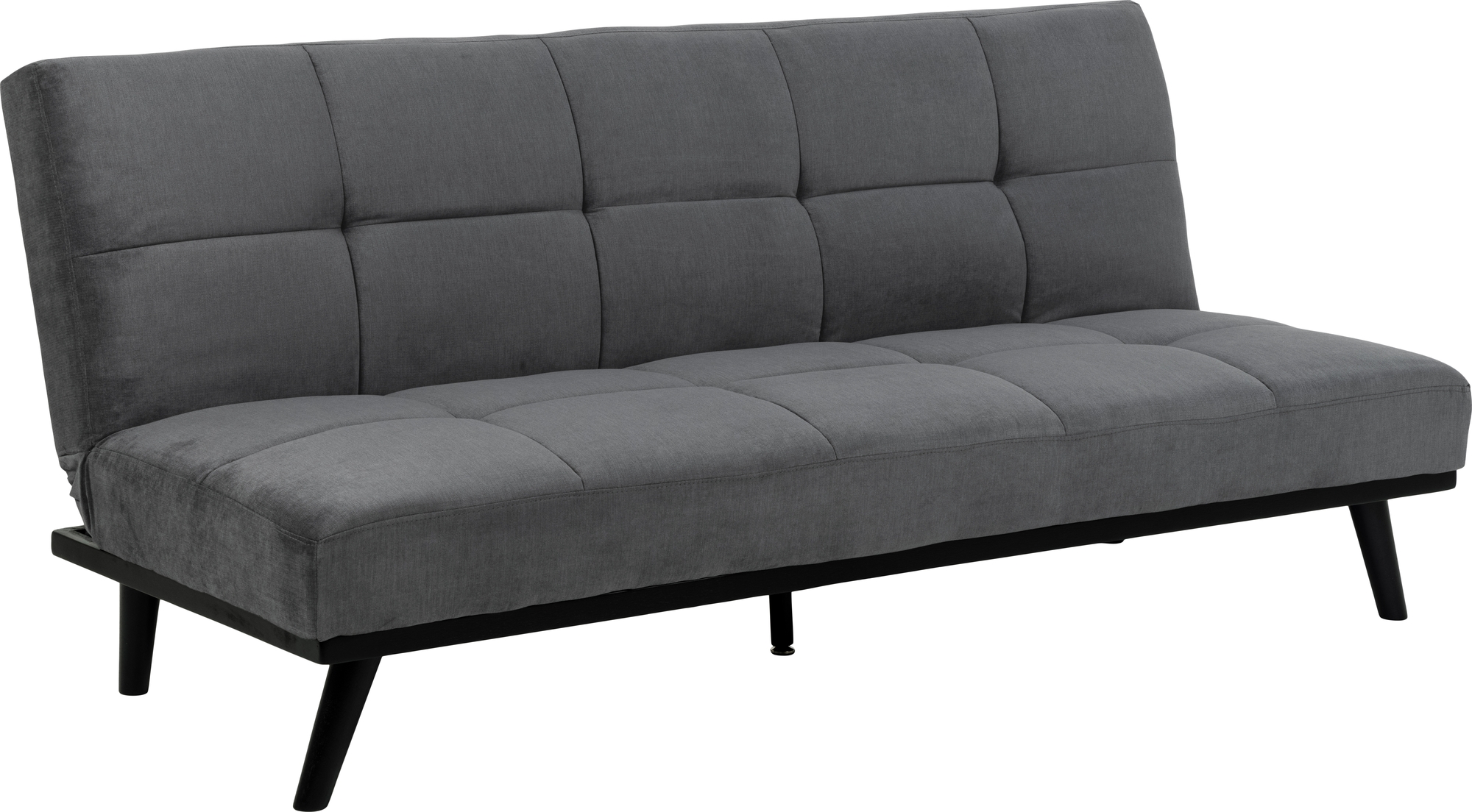 Sovesofa med sammenleggbar rygg med ben av lakkert gummitre og polyestertrekk.