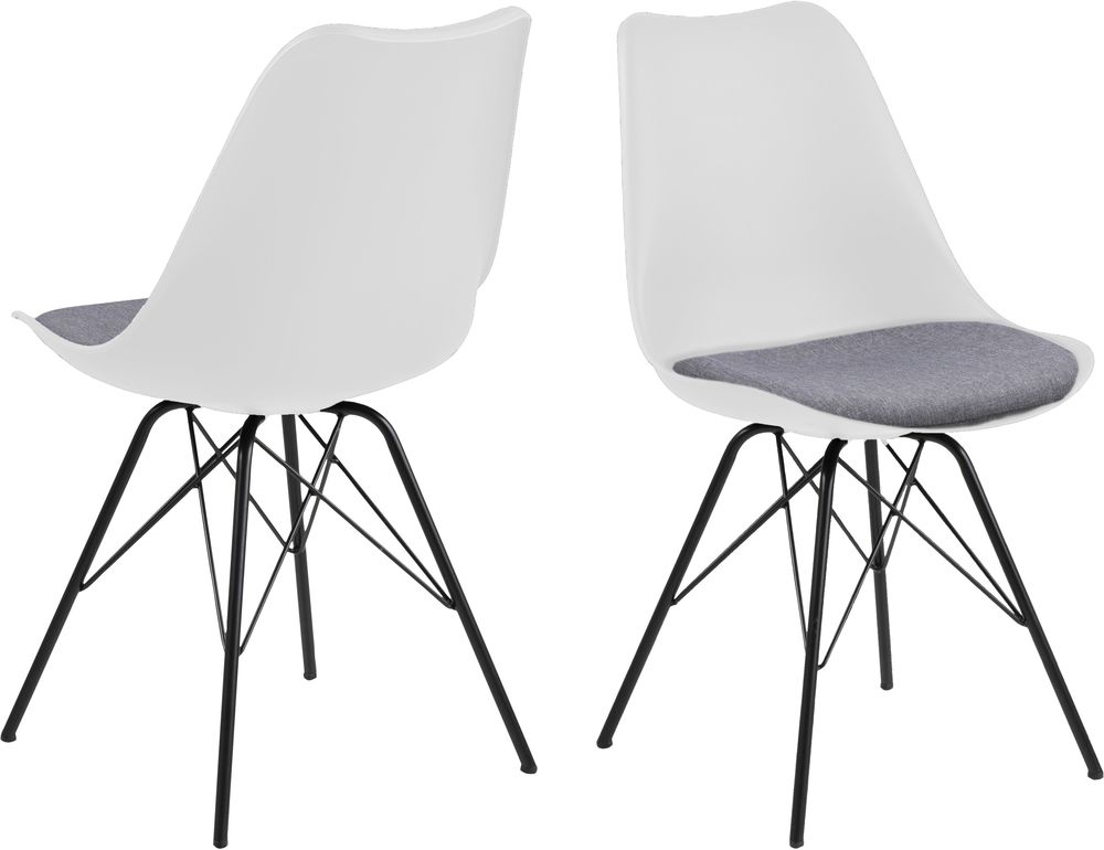 Spisestol med stamme laget av svart pulverlakkert metall, setet er av hvit plast og seteputen er kledd i lysegrått stoff for maksimal komfort.