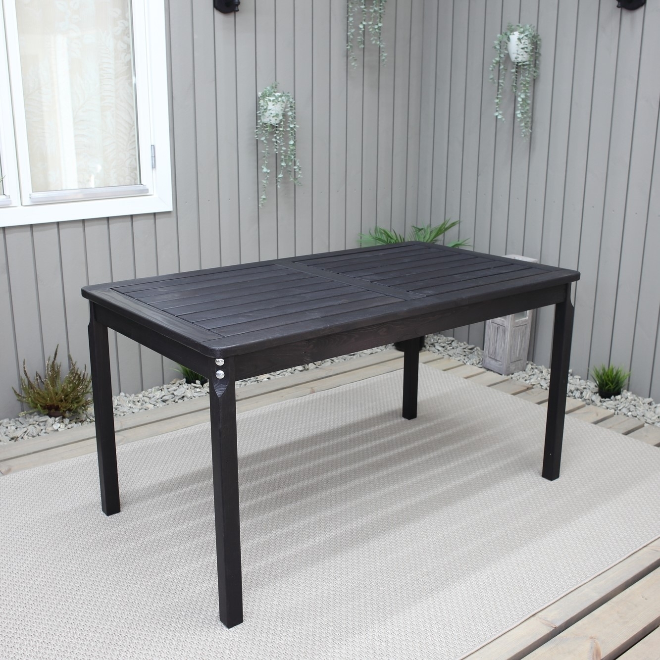Spisebord fra Skånska Möbelhuset i klassisk design. Robust i sortmalt furu, passer godt på de fleste uteplasser og terrasser.